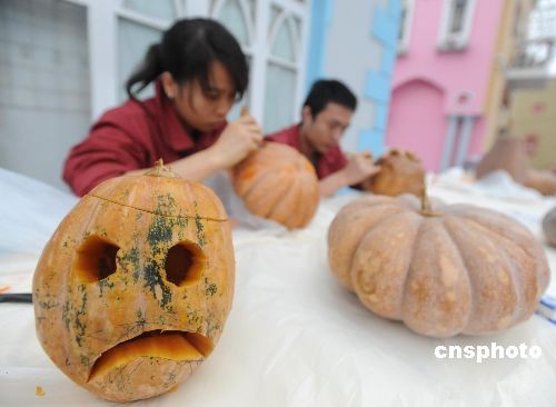 10月31日,是西方傳統(tǒng)的“鬼節(jié)”萬(wàn)圣節(jié)前夜。白天,下著蒙蒙細(xì)雨的長(zhǎng)沙處處寒意濃濃,長(zhǎng)沙世界之窗工作人員正在雕刻的“毛骨悚然”的各式南瓜,讓這個(gè)陰冷的節(jié)日多了幾分“鬼”意。中新社發(fā) 肖前輝 攝