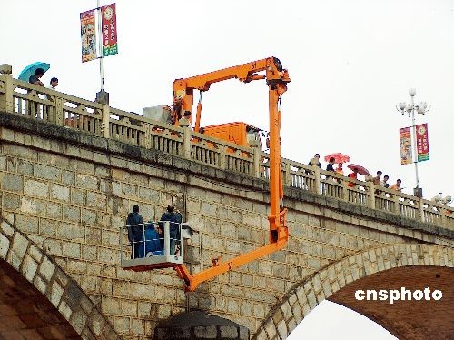 11月2日上午,廣西南寧公路局工程技術(shù)人員冒細(xì)雨為中國(guó)當(dāng)代最長(zhǎng)的石拱橋——--龍州大橋“把脈探傷”。龍州大橋建于上世紀(jì)60年代,為七拱方塊石料結(jié)構(gòu),橋長(zhǎng)約252米。在通車(chē)的43年來(lái),已經(jīng)受了4次大洪水的考驗(yàn)。中新社發(fā) 馮文 攝