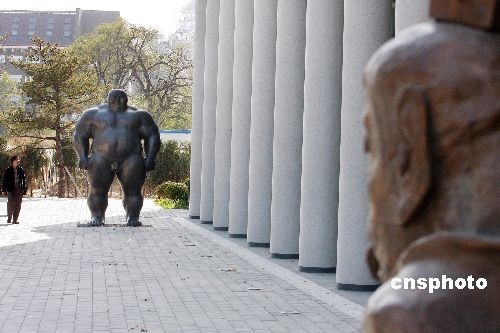 11月2日,北京大學(xué)光華管理學(xué)院新樓門前,中央美術(shù)學(xué)院雕塑系兩位老師申紅飆于2008年創(chuàng)作的《蒙古漢——站》,田世新于2003年創(chuàng)作的《剛?cè)嶂馈献酉瘛,吸引過往行人的目光。這兩尊雕塑,一尊是逾3米高、露生殖器的壯漢,一尊則是張嘴露齒的老子雕像,它們相對而立,近日引發(fā)爭議。中新社發(fā) 鄭雄增 攝