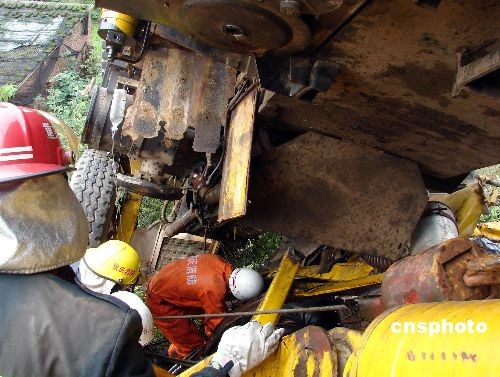 11月2日11時(shí)50分許,渝黔高速公路重慶至一品段10公里處,一輛長(zhǎng)江牌吊車因爆胎導(dǎo)致車輛失控,沖出護(hù)欄發(fā)生側(cè)翻,造成1人死亡,1人重傷。圖為消防人員緊急施救。中新社發(fā) 郭晉嘉 攝