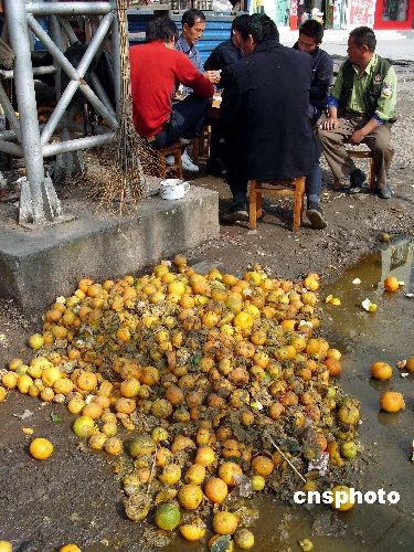 2008年11月3日,湖北宜昌市夷陵區(qū)土門鎮(zhèn),橘農(nóng)在向外地客商低價出售柑橘,路邊腐爛的柑橘隨處可見。據(jù)悉,受四川廣元“蛆柑”事件影響,沒有出現(xiàn)疫情的湖北省柑橘外銷曾一度全面停滯,經(jīng)有關有關部門“救市”后,目前銷售正在回暖,但收購價僅在每斤0.10元—0.35元,比往年的收購價每斤0.25元—0.65元大幅下跌,橘農(nóng)們經(jīng)濟損失慘重。 湖北宜昌柑橘年產(chǎn)量約148萬噸,占湖北省總產(chǎn)量的60%。柑橘是宜昌100多萬農(nóng)民的主要收入來源,其中包括30多萬三峽庫區(qū)和清江庫區(qū)移民。測算顯示,柑橘收購價格每降低0.1元,全市農(nóng)民人均收入將減少105元。中新社發(fā) 劉君鳳 攝