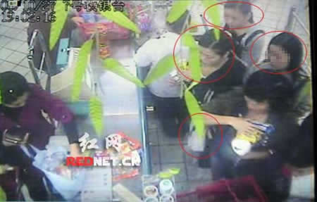 帖子中超市方監(jiān)控錄像上顯示,在7點02分左右,網(wǎng)友“菲林簍”手舉幾瓶果汁來到7號收銀臺付款,剛接完一個朋友的電話,她把手機放在上衣的右袋里,手機鏈還露在了外面,這時3個不明身份的女子從后圍在她身旁,一名黑衣女子站在最右邊,用包擋住“菲林簍”右袋,左邊一灰衣女子快速從其口袋中盜走手機,隨手轉(zhuǎn)移到中間扎著馬尾辮的灰衣女子手中,兩名灰衣女子很快逃離現(xiàn)場,黑衣女子假裝四處張望,很快也離開了。