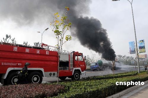 11月5日上午,位于河南省濮陽市濮鶴高速收費站東一公里處,一輛從河北省邯鄲市往濮陽市運輸散裝水泥原料潮石粉的歐曼重型卡車剛下高速公路,正在行駛時突然發(fā)生輪胎著火事故。在當?shù)叵拦俦目焖偬幹孟,火災得到及時撲滅。中新社發(fā) 劉敬寬 攝