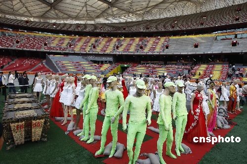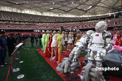 11月6日,在北京奧運(yùn)會開幕式中用于演出的服裝道具擺放在國家體育場“鳥巢”,供游客參觀。中新社發(fā) 杜洋 攝