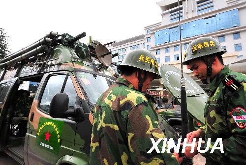 在云南楚雄等地發(fā)生滑坡泥石流災害后,云南民兵預備役應急通信分隊派出安裝著地理信息、GPS定位、衛(wèi)星圖像傳輸、微波無線通信等車載工作系統(tǒng)組合的移動指揮車及數輛前方信息偵察車,用科技手段為救災工作提供精確信息和清晰圖像。新華社記者 陳海寧 攝