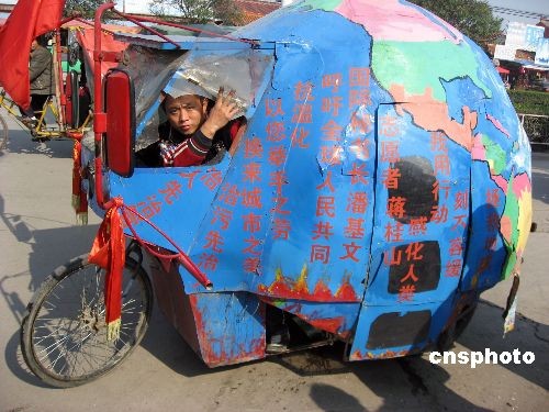 11月10日,一個(gè)地球模樣的三輪車來(lái)到安徽省亳州市宣傳環(huán)保,吸引市民駐足觀看。38歲的江西小伙蔣桂山自去年6月5日從江西九江開(kāi)始,騎著自制的直徑一米的地球儀三輪房車宣傳環(huán)保,先后途經(jīng)上海、天津等140個(gè)城市。之后,他來(lái)到安徽亳州講“環(huán)!薄JY桂山預(yù)計(jì)用4年時(shí)間蹬著“地球車”走遍全國(guó)400多個(gè)城市,向人們宣傳節(jié)約用水、用電和能源,他想用這種特殊的方式引起人們關(guān)注環(huán)保。中新社發(fā) 張延林 攝