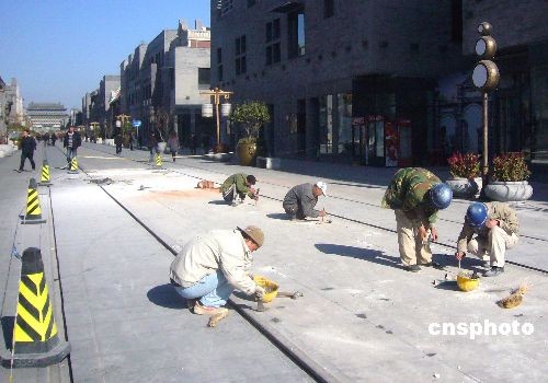 2008年11月13日, 北京前門大街南段,長50米、寬10余米的路段用警戒線圍了起來,施工人員正在對路面及其它設(shè)施進(jìn)行維修整理。據(jù)悉,由于運(yùn)貨車經(jīng)常經(jīng)過這里,致使部分青白石路面出現(xiàn)了裂縫和損毀。此次整修除了寬21米的大街外,中間的寬近3米長834米的青白石“御道”也是整修的重點(diǎn),預(yù)計,整個工期將在一個月內(nèi)完成。此次整修是對道路及地下線路的正常養(yǎng),而這次對御道的整修也屬首次。中新社發(fā) 玉龍 攝