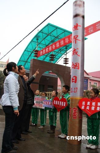 11月17日,小學(xué)生制作的巨無霸“香煙”引來過往市民好奇的目光。當日是“世界戒煙日”,山東棗莊市回民小學(xué)學(xué)生用舊報紙和卡紙等制作了一支3.6米高的巨無霸“香煙”模型,豎立在學(xué)校大門旁,并組成戒煙小分隊,勸告煙民戒煙。中新社發(fā) 吉 喆 攝