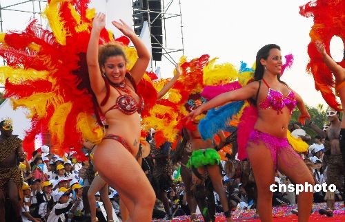 2008年11月16日,在海南省文昌市舉行的第九屆中國(guó)海南島歡樂(lè)節(jié)“狂歡大巡游”中,來(lái)自巴西的桑巴舞陣,將濃濃的異域風(fēng)情帶到海南。中新社發(fā) 善平 攝