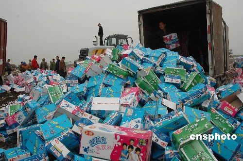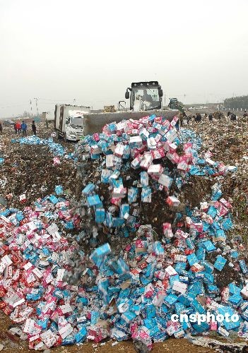 11月17日,河南南陽市臥龍區(qū)在生活垃圾處理場集中銷毀“三鹿”問題液態(tài)奶。當日,該區(qū)共銷毀從經(jīng)銷商回收和工商機關(guān)監(jiān)督統(tǒng)一下架、集中扣押、封存和消費者退回的問題“三鹿”純牛奶、酸奶、早餐奶等液態(tài)奶16噸,在生活垃圾場采取碾壓、深埋,進行無害化處理。中新社發(fā) 熊運彬 攝