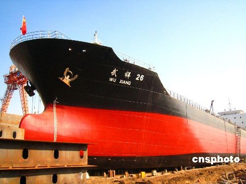 11月20日,一艘由中國農民制造的最大貨船,屹立在南京浦口“十里造船帶”的造船廠碼頭準備下水。這艘由“中華民間造船水運第一村”南京武家嘴村農民制造的貨船載重1.6萬噸、長146.2米、寬22米、進深11米,是迄今全國農民中造出的最大貨船。中新社發(fā) 谷昌旺 攝