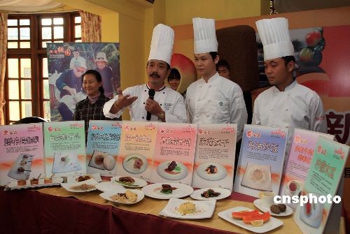 11月21日,被視為吸引大陸客“金字招牌”的臺(tái)灣“蔣家菜”,在蔣宋聯(lián)姻的上海“愛廬”旁的一餐廳高調(diào)亮相。來自臺(tái)灣桃園的大廚,在此一展寶島版“蔣家菜”的正宗烹調(diào)功夫!笆Y家菜”菜譜是海蜇絲筍、雪菜百葉毛豆、家常豆干、白菜獅子頭、沙參玉竹燉雞湯、無錫嫩子排、蒜子燒黃魚、雞油炒飯、養(yǎng)生牛肉茶、烤奉化芋頭、檸檬木瓜。美味佳肴涵蓋蔣介石的偏愛、蔣緯國喜好以及宋美齡的美容養(yǎng)生。據(jù)悉,正宗的一份桃園“蔣家菜”套餐,約合新臺(tái)幣五百元左右,針對(duì)大陸團(tuán),當(dāng)?shù)匾淹瞥龈鞣N優(yōu)惠。中新社發(fā) 潘索菲 攝