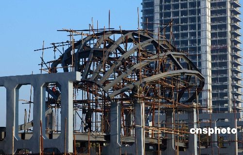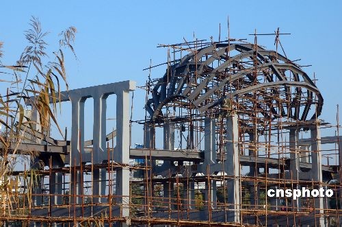 2008年11月21日,幾名工人在位于江蘇淮安古黃河上的中國南北地理分界標志建筑上施工。由于該工程前期施工時,地球狀標志物中間的橫梁設(shè)計過低,影響行人過往和其他實物的安裝,因此,在9月下旬工程施工過半后全部停工。目前工人們正在拆除中間的,主要是地球狀標志物下的幾根橫梁,重新澆鑄并提升橫梁高度,從而整體抬高地球狀標志物。中新社發(fā) 賀敬華 攝