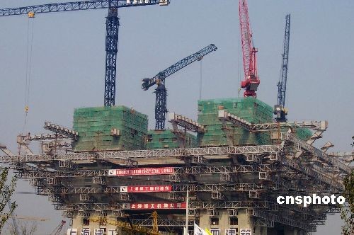 2008年11月25日,正在建設中的上海世博會中國館已初露雄姿,據悉計劃2009年年底竣工。 中新社發(fā) 周東潮 攝