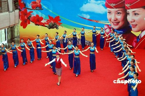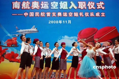南方航空公司二十五日在廣州宣布成立中國民航首支奧運(yùn)空姐禮儀團(tuán),從北京奧運(yùn)禮儀志愿者中選拔出來的三十四名“準(zhǔn)空姐”閃亮登場。中新社發(fā) 柯小軍 攝