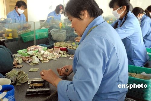 昆明公交公司共有196條無人售票公交線路,3200臺公交車,今年以來,平均每月都會收到近10萬元的假硬幣,僅此一項公交公司每年就要虧100多萬。圖為昆明公交公司收銀中心點鈔員正在點鈔。中新社發(fā) 蔣晨 攝