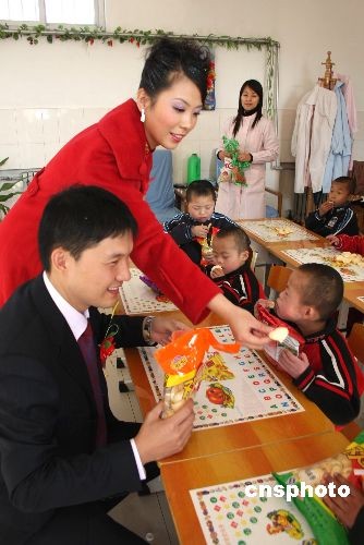 11月29日,身在廣東公安系統(tǒng)工作的梁智、王文星兩位新婚警察夫婦在河北滄州老家舉辦婚禮,他們決定把親友送的婚禮紅包禮金15888元分別捐獻(xiàn)給四川地震災(zāi)區(qū)和滄州市福利保障院的智障兒童。結(jié)婚典禮結(jié)束后,這對新婚夫婦驅(qū)車前往福利院看望兒童,并向當(dāng)?shù)孛裾块T捐獻(xiàn)了自己的結(jié)婚紅包禮金。中新社發(fā) 楊志濤 攝