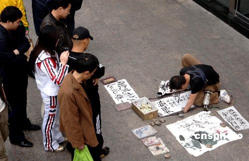 12月4日,左手小臂以下被截肢,右臂高位截肢的廣西男子劉國強(qiáng),在福州鬧市街頭口含毛筆作畫掙錢。2002年,劉國強(qiáng)在農(nóng)村家里打谷發(fā)生意外導(dǎo)致雙手截肢,之后他開始口銜毛筆寫字作畫掙錢謀生。中新社發(fā) 王東明 攝