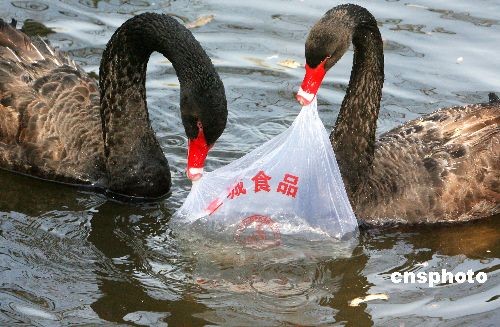 2008年12月6日,冬日暖陽(yáng)下的蘇州動(dòng)物園迎來(lái)不少游客。然而,在該園池塘里戲水游弋的幾只黑天鵝面對(duì)少數(shù)不文明游客亂扔并漂浮水面的塑料薄膜食品袋,既好奇又犯了難:天鵝們仿佛想從中尋找食物而用嘴含啄、吞咽,或竭力撕扯也無(wú)濟(jì)于事。后來(lái),在場(chǎng)目睹此情景的幾名好心游客為以防不測(cè),請(qǐng)來(lái)飼養(yǎng)管理人員將食品袋從水中一一撈起。 蘇州動(dòng)物園飼養(yǎng)管理人員敬告,游客應(yīng)文明游園,善待動(dòng)物,切莫如此戲弄或傷害可愛的黑天鵝。中新社發(fā) 蘇秀 攝
