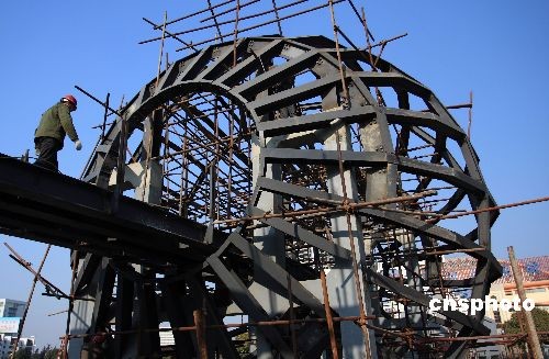 2008年12月14日,江蘇省淮安市南北地理分界線標(biāo)志工程中的主體標(biāo)志球已經(jīng)成形,人行通道欄桿也已安裝,工人們正在全力施工,力爭(zhēng)年底前工程竣工。中新社發(fā) 徐洪云 攝