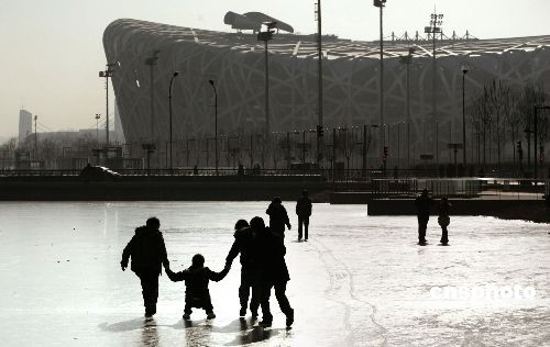 十二月中旬,北京“鳥巢”外的景觀湖已經(jīng)封凍,民眾在冰面上快樂嬉戲。中新社發(fā) 廖攀 攝