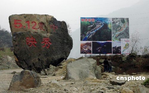 圖:地震災(zāi)區(qū)汶川縣映秀鎮(zhèn)在巨石上刻字留念