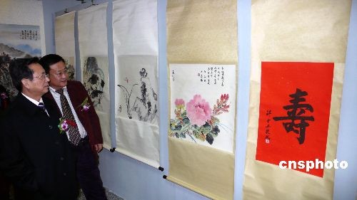 “兩岸文化交流展暨文化創(chuàng)意產(chǎn)業(yè)論壇”十九日在北京開(kāi)幕,展出了蔣介石、宋美齡、馬英九、連戰(zhàn)等兩岸名流的書畫作品。中新社發(fā) 徐長(zhǎng)安 攝