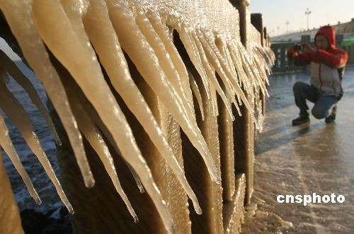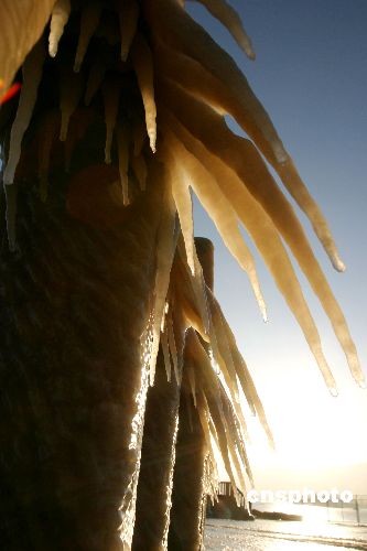 12月22日,受寒潮影響,江蘇連云港出現(xiàn)大風降溫天氣,最低氣溫零下8攝氏度。在偏北大風作用下,海上生成巨浪,濺在海岸邊護欄上的海水凍結(jié)成晶瑩剔透的冰凌。當?shù)貧庀蟛块T發(fā)布黃色寒潮預(yù)警,同時發(fā)出大風警報。中新社發(fā) 王健民 攝