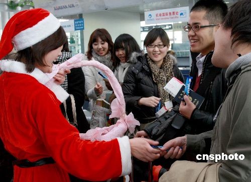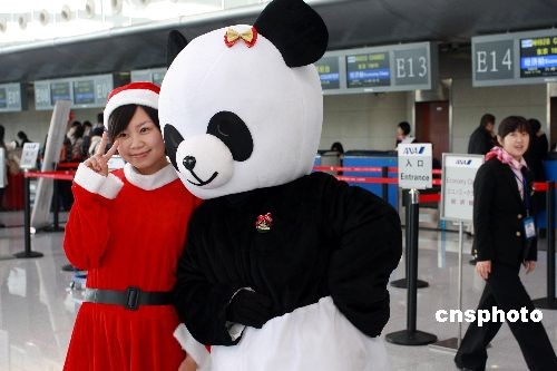 12月24日,圣誕節(jié)前夕,青島國(guó)際機(jī)場(chǎng)節(jié)日氣氛濃厚,工作人員裝扮成“圣誕女郎”和“可愛(ài)熊貓”,向日本游客送上節(jié)日祝福,歡送他們回國(guó)與家人團(tuán)聚過(guò)平安夜。中新社發(fā) 鄭雄增 攝