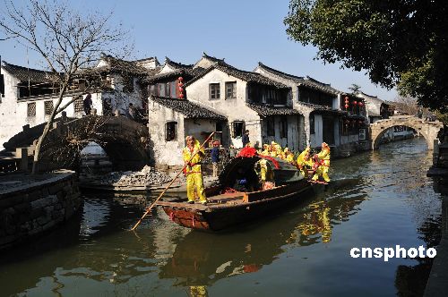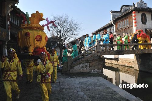 2009周莊開莊大典今日隆重舉行,吸引海內(nèi)外游客駐足觀賞。龍舞獅躍、鑼鼓震天、身穿彩袍、腳瞪皂靴的周莊巨賈“沈萬三”攜丫鬟、家丁百余人親自開莊迎客,并一路引著四海賓客巡游古鎮(zhèn)。具有傳統(tǒng)意義的開莊大典是對周莊文化旅游的又一次補(bǔ)充和延伸。中新社發(fā) 張衛(wèi)青 攝