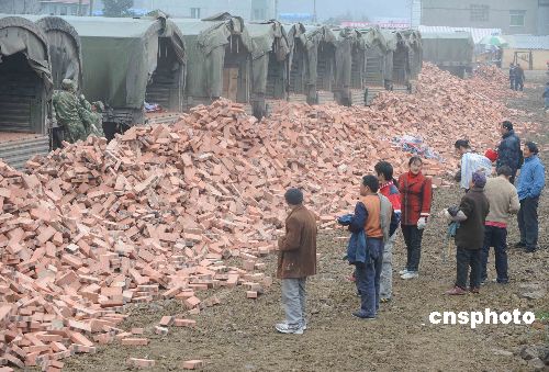 2009年元旦節(jié),解放軍成都軍區(qū)重返地震災(zāi)區(qū)的運(yùn)輸部隊(duì)冒著余震小雨,從重慶為重災(zāi)區(qū)北川縣曲山鎮(zhèn)災(zāi)民無(wú)償運(yùn)來(lái)重建家園急需的紅磚。中新社發(fā) 賈國(guó)榮 攝