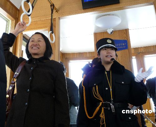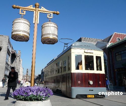 2009年1月1日,北京前門兩輛“鐺鐺車”舉行了開通剪彩儀式后,于上午11點(diǎn)正式載客運(yùn)行,京城市民及各地游客紛紛乘坐“鐺鐺車”感受老北京的風(fēng)情。時(shí)隔50年后那“鐺鐺”的聲音再次回到了煥然一新的前門大街。 中新社發(fā) 玉龍 攝
