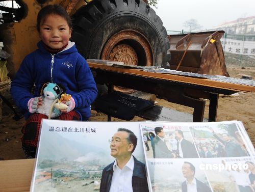 四川北川縣孤兒田洋洋的家被四川大地震唐家山堰塞湖掩埋,元旦假日她幫助外婆在曲山鎮(zhèn)賣(mài)地震紀(jì)念品。圖為她展示元旦節(jié)一位慰問(wèn)者送給的幾個(gè)小玩具。中新社發(fā) 賈國(guó)榮 攝