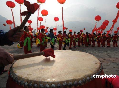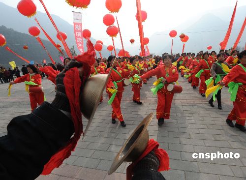 四川汶川大地震極重災(zāi)區(qū)北川縣擂鼓鎮(zhèn)由災(zāi)民組成的腰鼓隊(duì),2009年元旦節(jié)日期間載歌載舞,在余震中辭舊迎新。據(jù)四川省地震臺(tái)網(wǎng)測定,1月2日晚7時(shí),四川省綿陽市北川縣又發(fā)生一次4.7級地震,這次余震持續(xù)時(shí)間較短,但成都市區(qū)、眉山市、德陽市等地有明顯震感。中新社發(fā) 賈國榮 攝