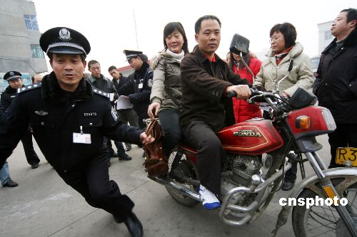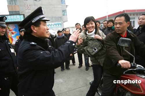 1月7日,河南許昌民警和熱心市民一起模擬防搶演練。春運(yùn)即將來(lái)臨,為讓旅客出行安全,河南許昌警方和熱心市民在該市客運(yùn)南站開(kāi)展“防搶奪反詐騙演練”活動(dòng),民警和熱心市民一起對(duì)“飛車(chē)搶奪”、“丟包”、“設(shè)陷阱”等常見(jiàn)的搶奪及詐騙手段進(jìn)行演練,為過(guò)往旅客防搶防扒防騙支招。中新社發(fā) 牛書(shū)培 攝