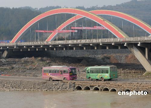 四川大地震重災(zāi)區(qū)北川縣,新年提前開(kāi)始的春運(yùn)力保災(zāi)民安全,橋上限小型車(chē)輛通行,而大型公交巴士等載重車(chē)輛只能在河灘臨時(shí)簡(jiǎn)易土路來(lái)往。中新社發(fā) 賈國(guó)榮 攝