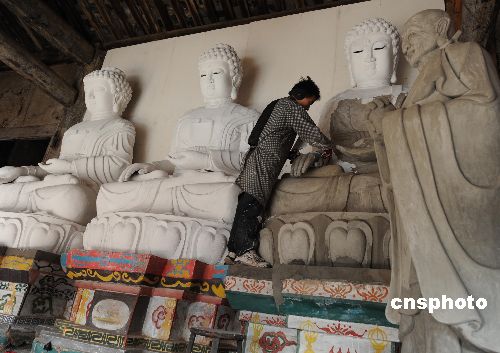 在四川大地震中受到損壞的北川縣古建筑黃恩寺,泥塑工匠新年伊始精心修復主殿三圣佛像。這座明末清初始建后歷代維護的古建筑,地處今春將開工的北川縣城新址中心位置。中新社發(fā) 賈國榮 攝