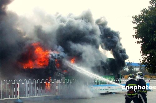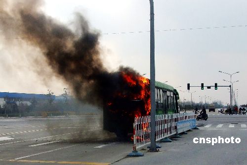 2009年1月9日下午兩時,江蘇鹽城市區(qū)一20路公交車行駛到鹽瀆路與西環(huán)路交界處發(fā)生自燃,當時車內有七八名乘客,由于疏散及時,并沒有造成人員傷亡,火也被消防人員及時撲滅,車輛卻受損嚴重,公交部門初步斷定起火原因是電路故障。中新社發(fā) 李根 攝