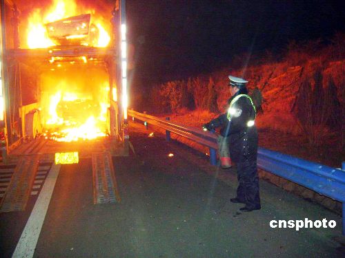 1月10日凌晨,一輛運(yùn)載著8輛海南馬自達(dá)轎車的大貨車,在湖北樊魏高速公路上無(wú)故起火,除搶救出一臺(tái)轎車外,其余7臺(tái)“海馬”燒成空殼。原來,駕駛員李某準(zhǔn)備將8輛海南馬自達(dá)3型轎車從重慶運(yùn)往吉林,途中發(fā)現(xiàn)裝有兩層車的下層,有一臺(tái)馬自達(dá)轎車起火,李某驚慌之下急忙救火。在民警的幫助下,駕駛員搶出一輛未著火的轎車,其余7輛轎車全部燒得只?諝ぁC窬F(xiàn)場(chǎng)調(diào)查發(fā)現(xiàn),火是起自下排一臺(tái)小轎車,懷疑是轎車自燃,但轎車本身并未發(fā)動(dòng),究竟如何起火,讓民警和司機(jī)都納悶不已。目前,該事故成因正在調(diào)查中。 中新社發(fā) 李得榮 攝