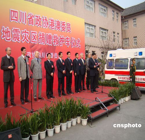 1月14日,參加政協(xié)四川省十屆二次會議的港澳委員向地震災區(qū)捐贈了一批救護車,用以改善地震災區(qū)受贈醫(yī)療機構醫(yī)療衛(wèi)生設備缺乏現(xiàn)狀。圖為救護車捐贈儀式現(xiàn)場。中新社發(fā) 王萌 攝