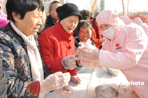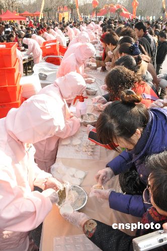 1月18日是農(nóng)歷新春小年,鄭州市“2009歡樂購物過大年”活動(dòng)在綠城廣場舉行,2009人在鄭州市綠城廣場一同包餃子并現(xiàn)場制作品嘗。中新社發(fā) 劉書亭 攝