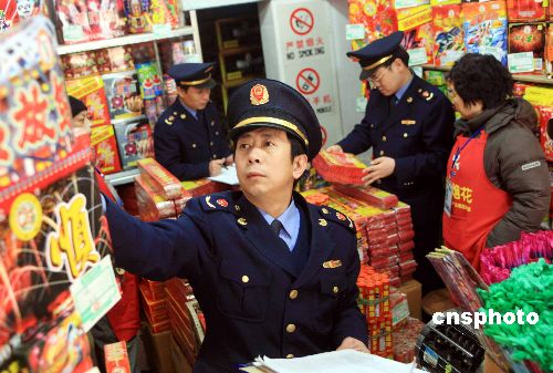 一月十九日,是北京2009年春節(jié)銷售煙花爆竹的首日,為保障市民安全歡度新春佳節(jié),西城工商執(zhí)法檢查人員對首日開始銷售的市場進(jìn)行檢查。中新社發(fā) 任海霞 攝
