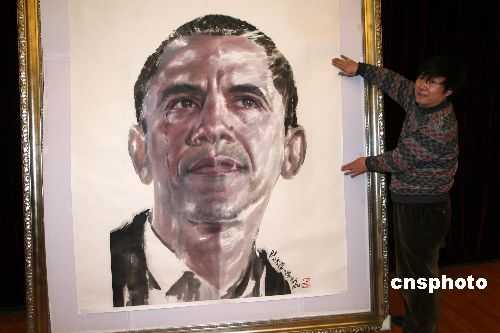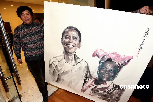 1月20日,中國著名畫家于成松大型中國畫《朗朗青空》在北京與觀眾見面。作品以奧巴馬為原型,圖中奧巴馬面掛激動的淚花,頭微微仰望遠(yuǎn)方。于成松說,想通過創(chuàng)作該幅作品,加深中美兩國人民的了解和友誼。畫家同時(shí)創(chuàng)作了以奧巴馬和他的肯尼亞奶奶為原型的作品《盈盈厚土》。中新社發(fā) 杜洋 攝