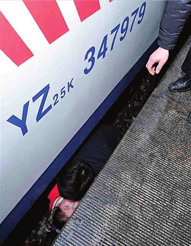20日下午,列車員正在救助不慎跌落站臺(tái)的女童。當(dāng)天,在北京西站,一列開往西安的T231次火車即將發(fā)車,一名女童在隨父母奔跑趕車過程中,不慎從站臺(tái)與列車之間的縫隙跌到列車底下。列車員聞?dòng)嵑笱杆仝s到現(xiàn)場,將受驚嚇的女童救出。(郭莎莎攝)