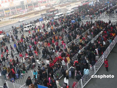 2009年1月21日,北京西站人頭攢動、旅客如織。據(jù)北京西站方面透露,根據(jù)車次的售票情況看,21日單日上車客流將超過23萬人次,達到本次春運節(jié)前的峰值。中新社發(fā) 玉龍 攝