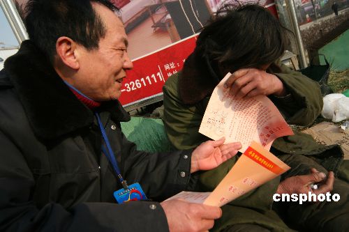 1月22日,許昌市救助管理站的工作人員在救助一個(gè)生活無(wú)著人員。春節(jié)即將到來(lái),為更好地向困難群體獻(xiàn)愛心、送溫暖,不讓一個(gè)生活無(wú)著人員流落街頭,當(dāng)日,河南省許昌市救助管理站開展“迎新春社會(huì)關(guān)愛生活無(wú)著人員”活動(dòng),對(duì)符合救助條件的求助者,無(wú)償提供食宿、幫助聯(lián)系親屬等。這次活動(dòng)除與各區(qū)縣救助站同時(shí)開展宣傳、咨詢活動(dòng)外,還會(huì)派流動(dòng)小分隊(duì)走上街頭,對(duì)生活無(wú)著人員進(jìn)行勸導(dǎo),實(shí)施現(xiàn)場(chǎng)救助。中新社發(fā) 牛書培 攝