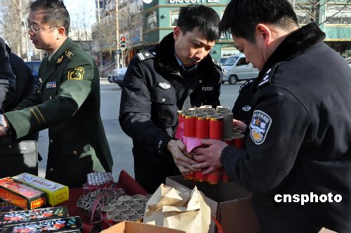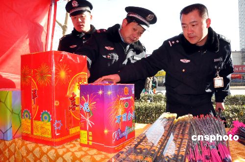 1月23日,為確保春節(jié)安全,鄭州市公安局金水分局組織治安、消防大隊(duì)、轄區(qū)派出所,全面展開對(duì)煙花爆竹違規(guī)燃放、販運(yùn)和銷售煙花進(jìn)行嚴(yán)格檢查。截至目前,共清查集貿(mào)市場(chǎng)、街道鄉(xiāng)村攤點(diǎn)317余處。中新社發(fā) 劉書亭 攝