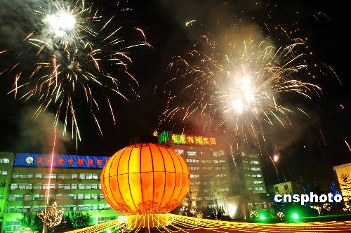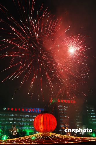 1月25日除夕夜,東北特鋼集團大連基地廣場五彩繽紛禮花綻放空中,迎接牛年到來。當(dāng)晚,大連市大街小巷爆竹聲聲,人們在絢爛的煙花中迎來2009農(nóng)歷新年。中新社發(fā) 劉德斌 攝