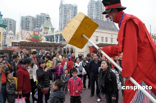 一月二十六日,中國(guó)農(nóng)歷大年初一,深圳歡樂(lè)谷、世界之窗、紅樹林海濱公園、東部華僑城等旅游景區(qū)游人如織。圖為深圳歡樂(lè)谷滑稽演員與游客同樂(lè)。中新社發(fā) 陳文 攝