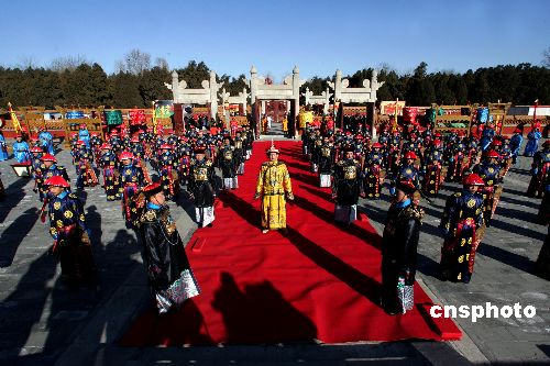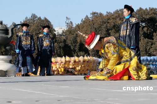 1月26日農(nóng)歷正月初一,第24屆地壇春節(jié)文化廟會如期舉行,廟會歷時8天,至2月1日截止。每年地壇廟會,地壇公園芳澤壇都會舉行場面宏大的仿清祭地表演,“皇帝”帶領文武百官、侍衛(wèi)儀仗等200余人身著盛裝祭祀,祈求地神保佑、國泰民安、風調(diào)雨順、五谷豐登,今年的祭地表演則因為“草根皇帝”的海選而備受關注。從普通市民中遴選出來的“草根皇帝”李少華正式上任,迎神送神、三叩九拜,在數(shù)百游園觀眾的注視下,黃袍加身的李少華邁著堅定的步伐,完成了一次皇家禮儀文明之旅。中新社發(fā) 富田 攝